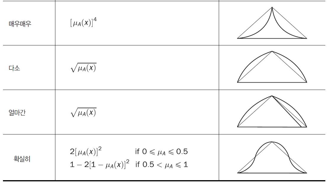 - 다소(more or less) : 집합을 확장함으로써 퍼지 원소들의 소속도를 높인다.