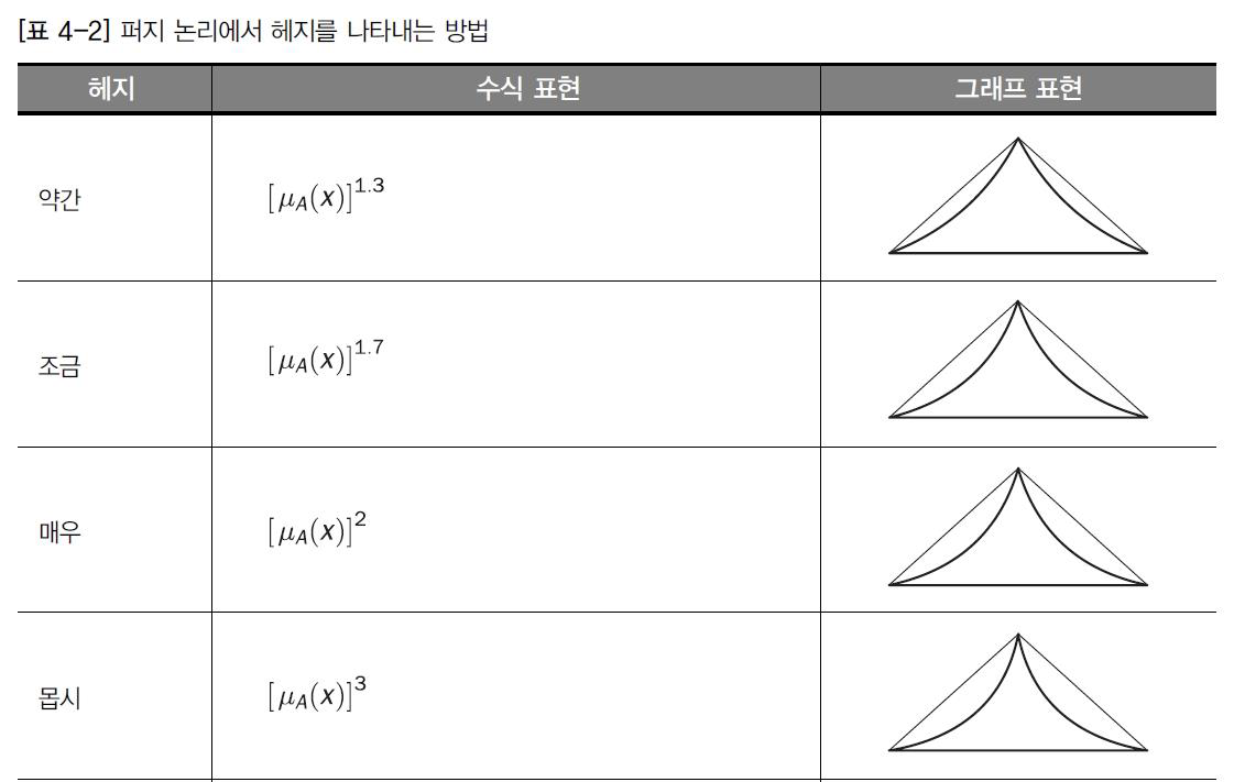 - 언어변수는 헤지라 하는 퍼지 집합 한정사의 개념을 수반