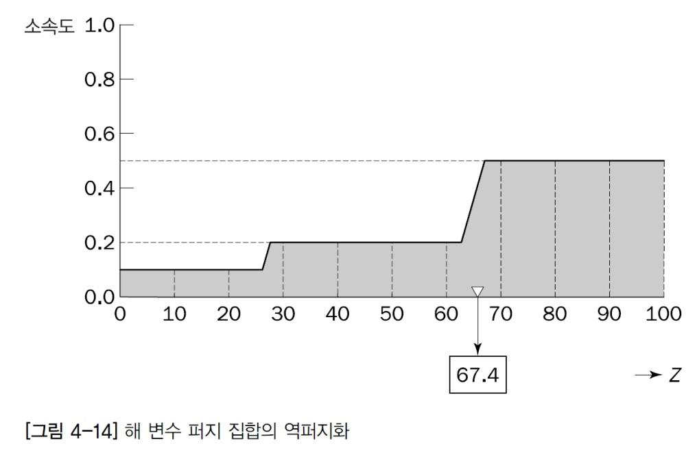 - 퍼지 추론 과정의 마지막 단계는 역퍼지화다.