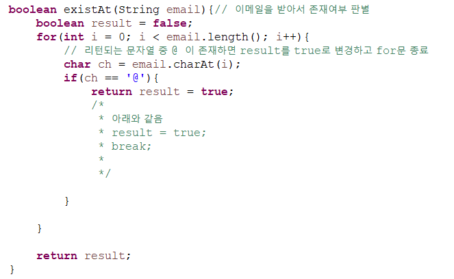 아래에 있는 result = true; / break; 를 축약한것과 같습니다. return은 구문 탈출용으로 쓰기 때문에