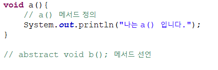 메서드의 정의 방식입니다. 위에 있는 것은 메서드 정의 , 아래에 있는 것은 메서드 선언 인데요