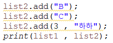 출력하면 [0, 2, 4, 하하, B, C] / list1 은 그대로 나오고 list2가 저런 형태로 나오게 됩니다.