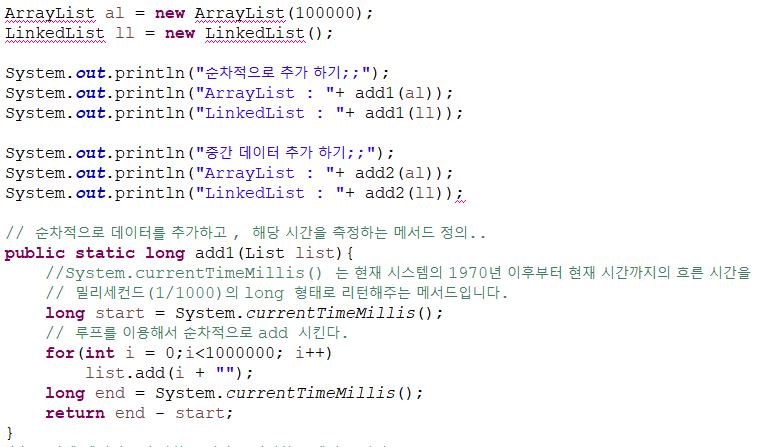 ArrayList와 LinkedList의 수행속도 차이를 알 수 있는 예제 입니다.