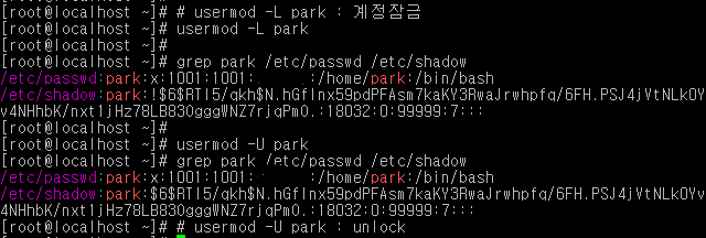 잠금의 유무는 /etc/shadow:park: 바로뒤에 !가 붙어있음을 통해 알 수 있습니다.(!있으면 잠금 , 없으면 unlcok)