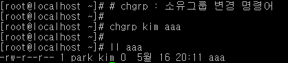 소유그룹을 kim이라 바꾸려면 chgrp kim aaa , 소유자를 바꾸는 명령어 형태와 비슷합니다.