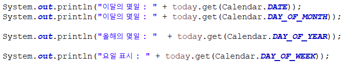 # Calendar 객체 Calendar 객체 생성법 : static 메서드인 getInstance() 를 이용해서 얻어냅니다. 생성된 객체의 모든 정보는 기본적으 로 get(int field) 을 이용해서 얻어냅니다. 이 때 파라미터 정보로는 Calendar 클래스의 static field 를 이용합니 다. ex>Calendar.YEAR --> 연도 정보 여러가지가 있습니다만.. 위에것을 하자면 이달의 몇일인지 올해의 몇일인지 등을 표시할 수 있습니다. 저렇게 코드를 짜면 순서대로 19 / 19 / 109 / 6 이 뜹니다. Calendar add 입니다. Calendar add(int field, int amount) --> 변경할 날짜 필드에 amount 값을 증감 시키는 메서드 다른 시간 값에도 ..